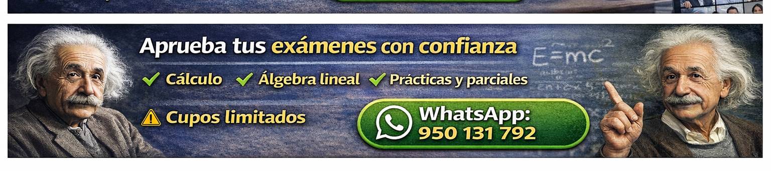 🎓 Clases de Matemáticas Online (NIVEL UNIVERSITARIO) ¿Buscas clases de matemáticas online para mejorar tus notas o aprobar tus exámenes? Ofrezco clases personalizadas por Zoom, ideales para estudiantes universitarios que necesitan apoyo en cursos exigentes. 📚 Cursos disponibles ✔ Clases de cálculo universitario ✔ Clases de álgebra lineal ✔ Clases de matemáticas ✔ Resolución de tareas y prácticas ✔ Preparación para exámenes parciales y finales 💡 Metodología de enseñanza Las clases se desarrollan en vivo mediante Zoom Pro con pizarra digital interactiva. ✔ Explicación clara paso a paso ✔ Resolución de ejercicios en tiempo real ✔ Adaptación al nivel del estudiante 💻 Modalidad -Clases 100% online desde cualquier lugar. -Plataforma: Zoom + pizarra digital -Horarios flexibles -Clases individuales 🎯 Beneficios ✔ Aprende desde cero o refuerza conocimientos ✔ Mejora tus calificaciones ✔ Prepárate para exámenes con confianza 📲 Contacto 950131792 -Reserva tu clase ahora.